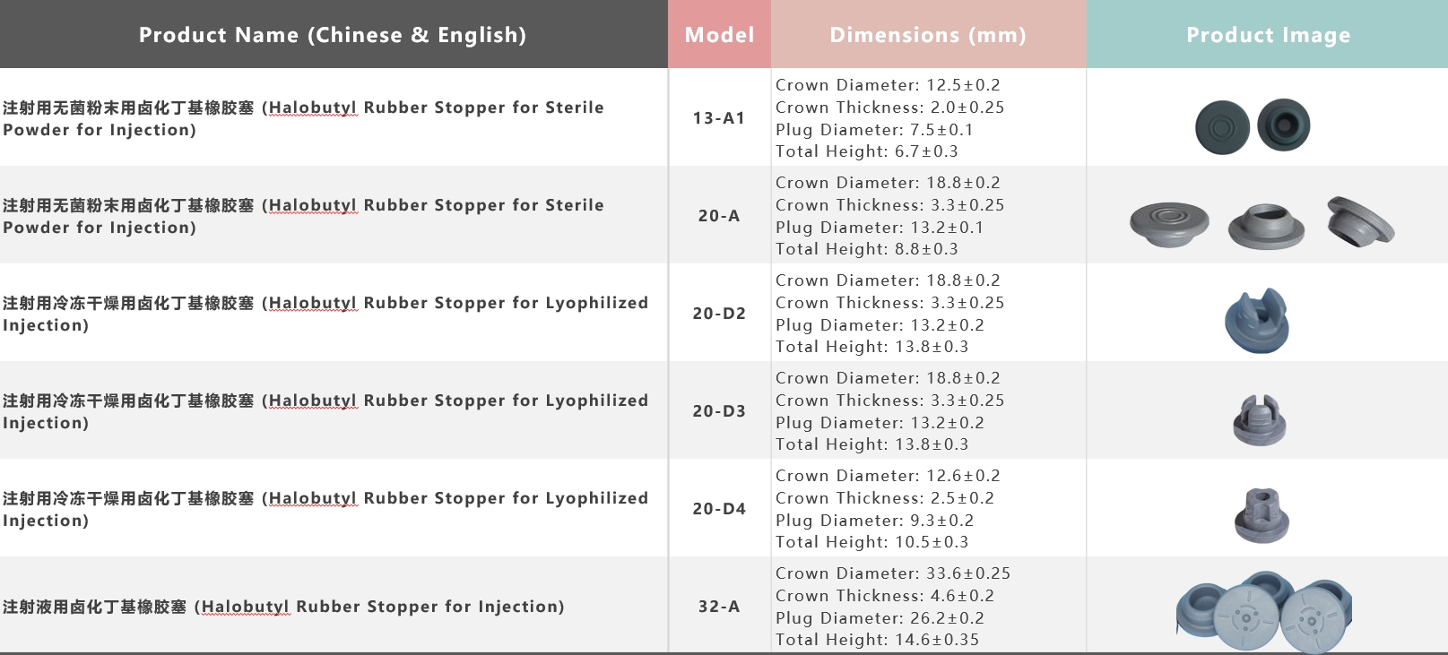 *This series of halobutyl rubber stoppers is designed for powder, lyophilized, and liquid injections. With excellent barrier properties and chemical inertness, they meet YBB standards.The above are stocked models; other specifications are available upon request (customization supported).